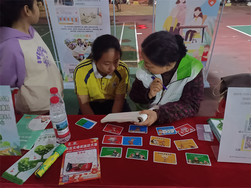 在未成年人心理健康服务展区,惠城区未成年人心理健康辅导中心立足群众需求导向,将服务转化为乡村易接受、能运用的实践载体,让心理健康理念真正扎根乡土土壤。教育宣传环节坚守“接地气、暖民心”原则,工作人员通过发放定制宣传彩页、现场互动答疑、性格卡牌体验等多元形式,以通俗易懂的乡音俚语解读未成年人心理健康知识,将抽象的心理学原理转化为可感知、可运用的生活技巧,切实打通科学育儿理念进村入户的“后一公里”,助力构建家校社协同育人的良好格局 。咨询服务环节聚焦家长急难愁盼,针对青少年情绪管理、亲子沟通、行为习惯养成等高频困惑提供一对一耐心指导,同步细致收集村民服务需求,为后续优化服务内容、提升服务效能奠定坚实基础,以实际行动回应群众对美好生活的精神诉求。这一举措既是惠城区完善“学校—社区—专科机构”心理服务体系的延伸实践,更是“心理健康下乡村、进社区”的有益探索。