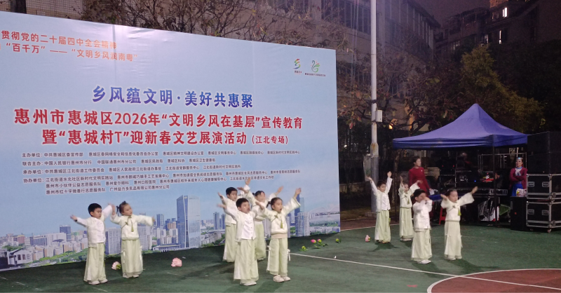 为深入学习贯彻新时代中国特色社会主义思想,落实乡村振兴战略总要求与广东“百千万工程”部署,以精神文明建设赋能基层治理提质增效,1月30日晚,虽天色微阴,惠城区江北街道水北社区文化广场却欢声如潮、暖意融融。“风蕴文明,美好共惠聚”惠州市2026年文明乡风建设实践活动暨“惠州村T”迎新春文艺展演在此隆重启幕,惠州市惠城区未成年人心理健康辅导中心携化、接地气的特色服务倾情参与,为文明乡风注入鲜活“心”动能。
