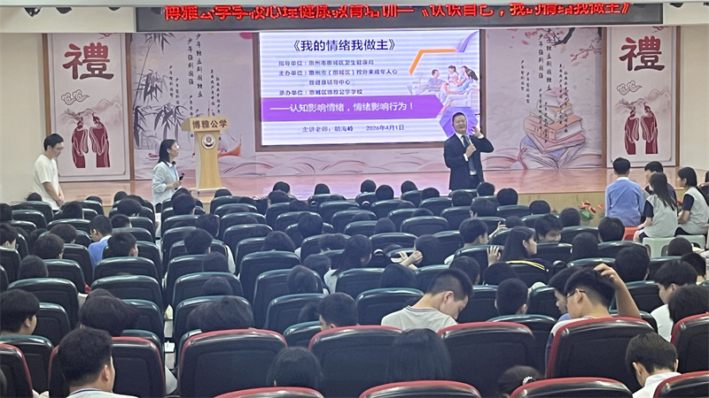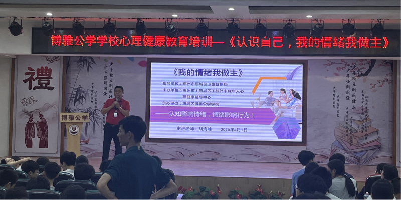 本次讲座由惠城区卫生健康局指导,辅导中心主办,博雅公学承办,紧扣青少年心理发展特点,从 “什么是情绪”“情绪的魔法与陷阱”“情绪 ABC 理论”“摆脱不良情绪” 四大维度层层展开。胡老师凭借扎实的心理学功底和丰富的心理咨询经验,将理论与青少年日常学习生活场景深度结合,以考试紧张、同伴矛盾、师长批评等学生高频遇到的情绪场景为切入点,生动阐释了情绪的本质与核心特征,让同学们理解情绪是内心的 “信使”,而非成长的 “敌人”。