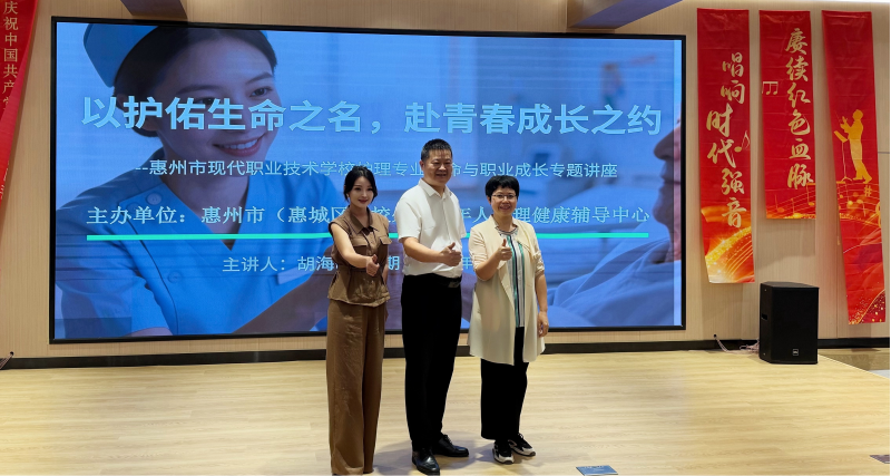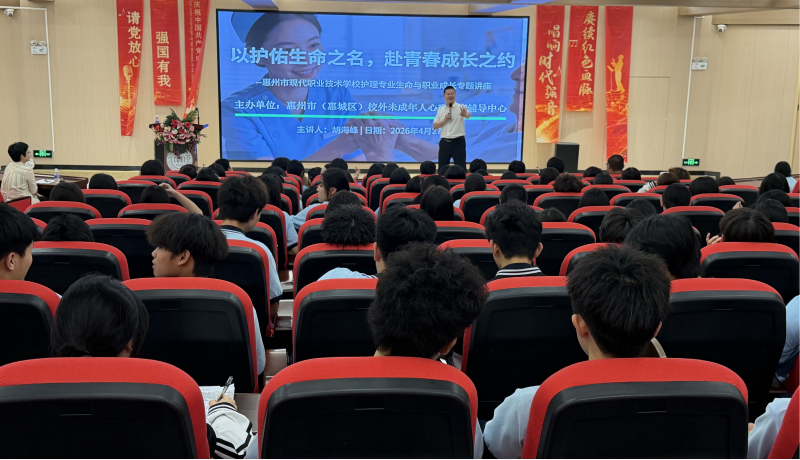 为深入贯彻落实立德树人根本任务,积响应 “健康中国” 战略,引导青少年树立正确的生命观、职业观和价值观,4 月 27 日晚,由惠州市(惠城区)校外未成年人心理健康辅导中心主办的《以护佑生命之名 赴青春成长之约》专题讲座在惠州市现代职业技术学校隆重举行。中心心理咨询师胡海峰老师应邀为该校护理学生作专题授课,曾煜珊老师全程参与,现场气氛庄重而热烈。